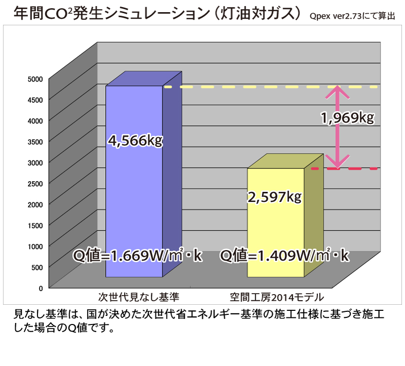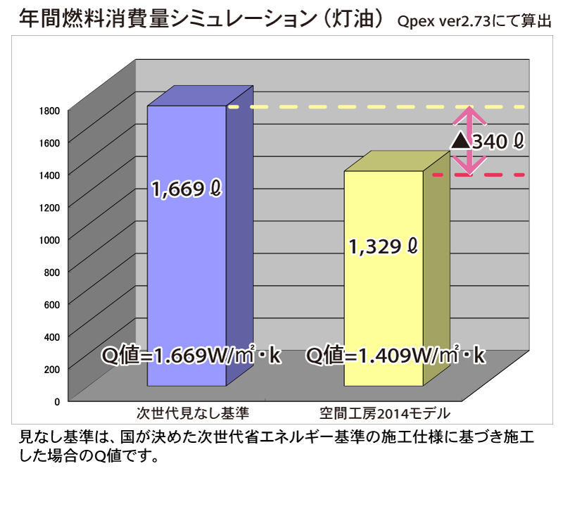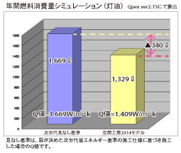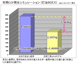 灯油とガスです。見なし基準の住宅は一般的な住宅との比較にしました。今回のモデル住宅はガスと電気を使用するハイブリッド型の暖房システムを使用します。